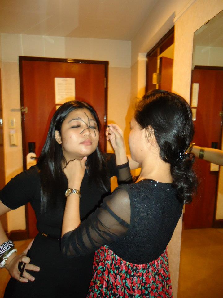 Lanoline, the best party organizer ever was as usual the brain behind the spooky set up, the yummy foods, and the naughty games! A rented room at Atrium Hotel near LRT Buendia (which is by the way an overly strict hotel) was turned temporarily into a creepy place. I admired how they set it up like a pro! Armed also with a masquerade, which the Liwag girls have heartily made themselves, we donned into our black pieces and slashed out some halloween make ups onto our faces. So wee, naughty evils were on their way to a naughtier night!